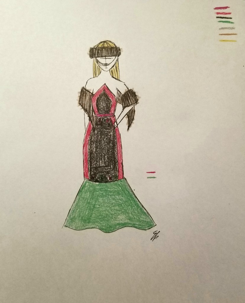 Right off the bat, I realized that, with the addition of the hat and stole, the top of the design was very wide and busy. To balance this out, I decided that the skirt would need to be slimmer and therefore less heavy looking. This also would give the design a more modern look. I ended up adding a mermaid skirt back into the design to make it appear more formal, but still balanced. (Also, I got rid of the bow that was supposed to mimic the string ties on a cape. This, combined with the more modern skirt, make this dress read less like a little girl’s Easter Sunday dress.)