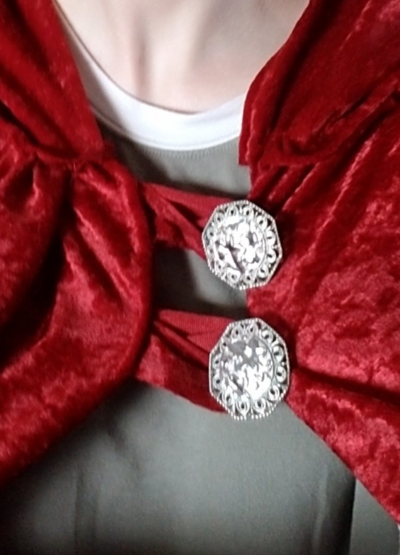 Pretty cool, right? I made it using a simple tutorial from The Spruce Crafts and two yards of a red fake velvet that was on sale at JOANN. I also ended up turning two costume earrings as buttons to hold it together at the neck.
